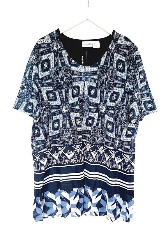 Свободная туника Mia Moda на пышные формы, с приятной к телу вискозной ткани. Трикотаж-нижний слой,верхний нейлоновая принтованная ткань, похожая на мыкросеточку. Отлично тянется. Отличное качество!. Цвет темно-синий. Новая,без навесной бирки. ПОГ-68 Длина-86 Полуобхват по низу-77