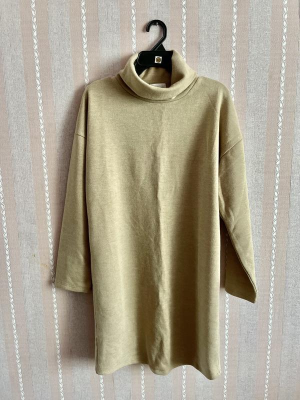 Сукня-туніка вільного крою з широкими рукавами. Має невеликий дефект у довжині, одна сторона ~на 1 см довша, але це помітно тільки, якщо рівно розкласти сукню на поверхні. Довжина по спинці 84 см, ОГ 100 см. Підійде на розмір S-M
