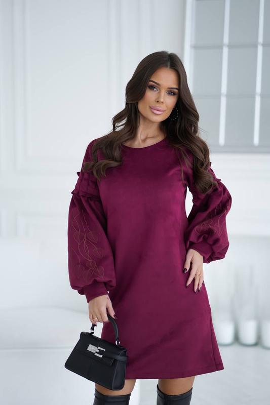 Сукня з вишивкою на рукавах 7539 Розмір: S-M(42-44), L-XL(46-48) Тканина: замш на дайвінгу + вишивка Довжина: 88 см Кольори: зелений, бордо, беж, капучино