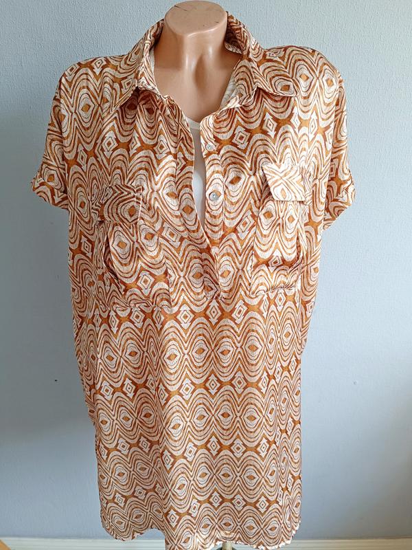 Туніка, сукня-сорочка прямого вільного крою, спереду планка на гудзиках, на грудях накладні кишені, збоків розрізи, розмір европейський L (може бути більше), виміри: довжина - 85 см, ПОГ - 62 см, ПОС - 64 см, довжина рукава від горловини - 28 см. Підписуйтесь та дивіться інші мої товари, так Ви зможете знайти цікаві ексклюзивні речі. Буду щиро рада співпраці з Вами.🙂 ПОВЕРНЕННЯ та ОБМІНУ ТОВАРУ НЕМАЄ!