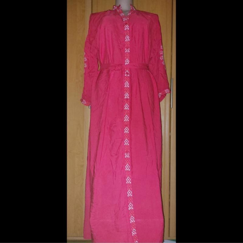 Туника вышита. Красная с красно- белой вышивкой в украинском стиле. Женщина, которая ее надевает выглядит стройнее.