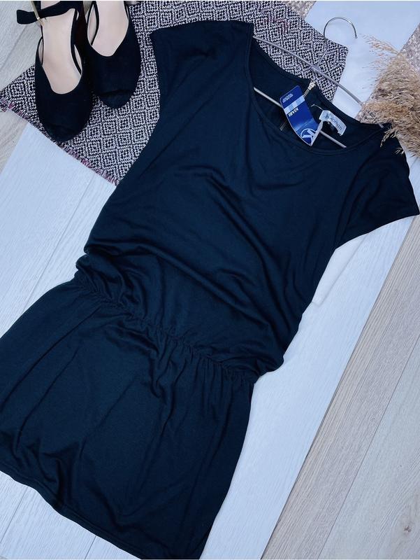 ✨Чорна коротка сукня-туніка Kiabi Розмір:універсальний/S до XXL/ Стан:нова,з біркою Особливості:тоненька трикотажна сукня з гумкою нижче лінії талії .Ззаду на блискавці . ФОТО НА ТІЛІ НЕ РОБЛЮ! Заміри(від шва до шва): Плечовий шов(спущені)-56 ПОГ-51,тягнеться до 65; Півобхват талії-48,тягнеться до 62; Півобхват стегон-50,тягнеться до 70; Довжина-83; По низу-55