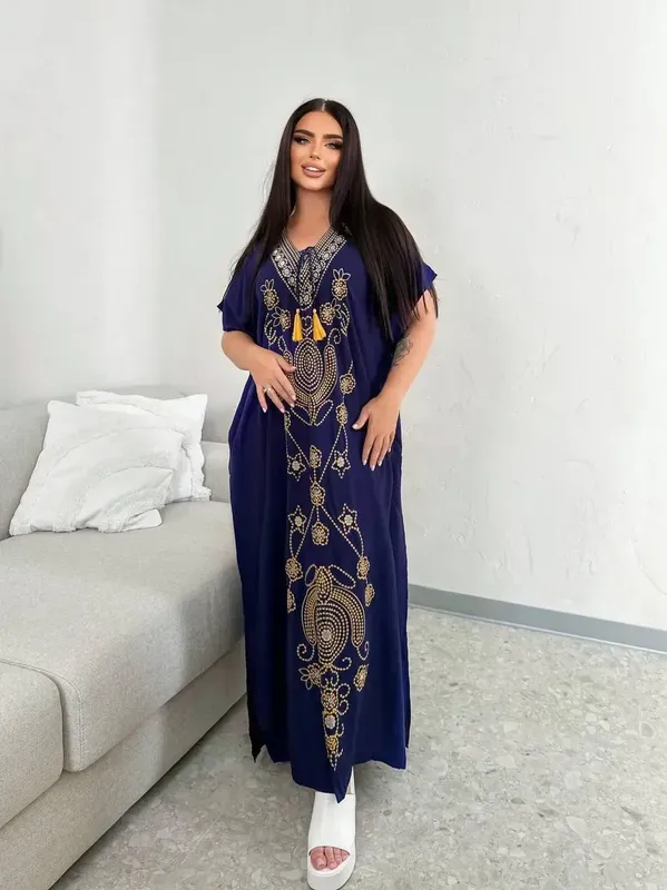 Восточная роскошь для каждого дня! SW665 Платье-абая в насыщенном синем цвете с изысканной вышивкой золотом Свободный крой, красиво ниспадающий по фигуре – ничего не обтягивает, лишь подчеркивает вашу женственность Идеально для размера plus size – не сковывает движений, дает ощущение легкости и комфорта Вышивка: элегантный восточный мотив Легкая ткань вискоза – не просвечивает, не парит Цвет: глубокий синий с золотом Размер универсальный (хорошо садится на XL-4XL)- грудь/бедра до 135 см Доставка по Украине и за рубеж