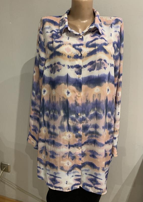 Стильна брендова подовжена блузка/ туніка в оригінальному принті в пастельних кольорах, приємна тканина, висока якість, рівна, боки з розрізами. Стан чудовий. Пог 65 см, Пос 66 см, плечі 41 см, рукав 61 см, довжина 78 см