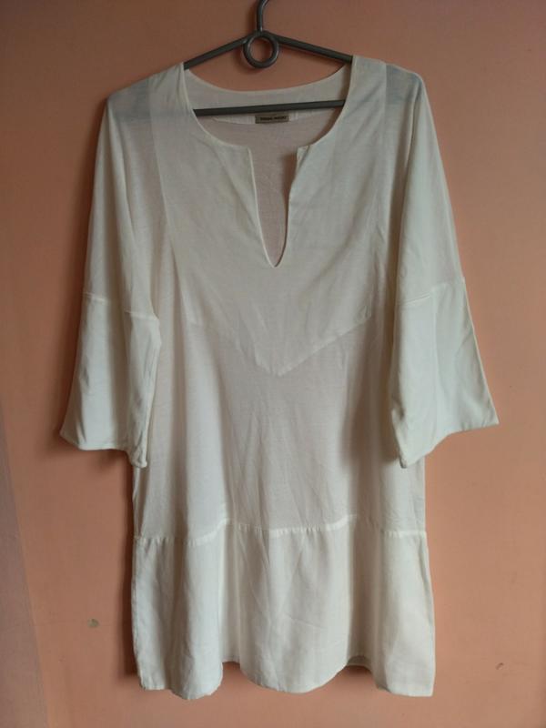 спереді внизу є 2 жовтяві плями,не дуже помітно й внутрі на воротнику по лінії трошки жовтяве полуобєм грудей 49 см ширина в самому низу 62 см довжина рукава від воротника 54 см довжина туніки від плеча 84 см