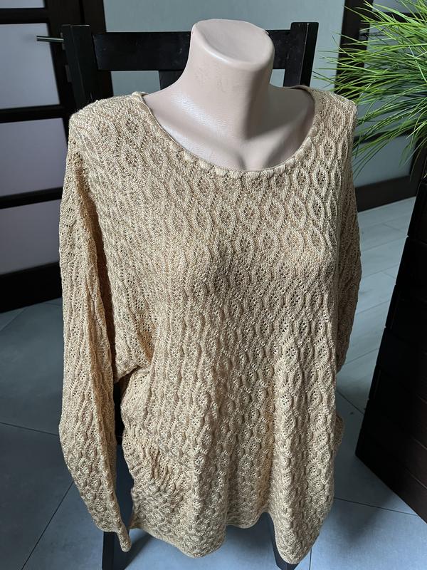 Нарядна туніка з люрексовою ниткою батального розміру. Красивий карамельний колір. Довжина 81 см , обхват грудей 135 см. Колір такий , як на фото з бірками.