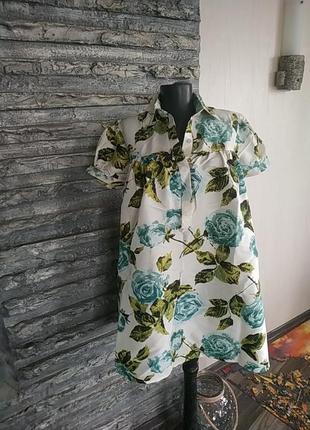 Красивий квітковий принт,холодні шовк,кишені.Нюанс кілька цяток,не дуже помітних на тлі малюнка на фото,крихітна дірочка,яку б ви не помітили..Заявлений 38,підійде на невеликий М і на S. ПОГ47 ПОБ72 Длина81 Плечо12 Рукав18 Ціна з урахуванням нюансу.