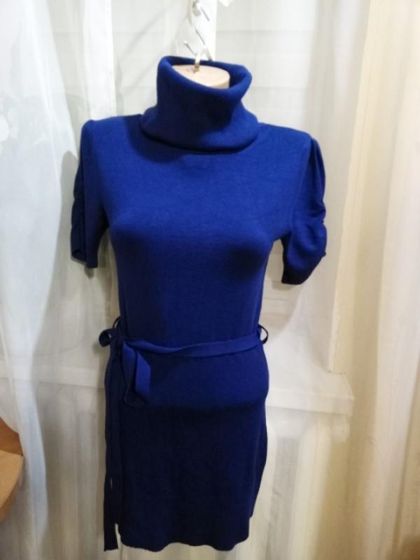 колір синьо -білий, розмір 36-38, заміри:плечт 37-40, рукав в зборочку-длина26, грудь44-48,талія 40-45,длина74 ,в складі є стрейч