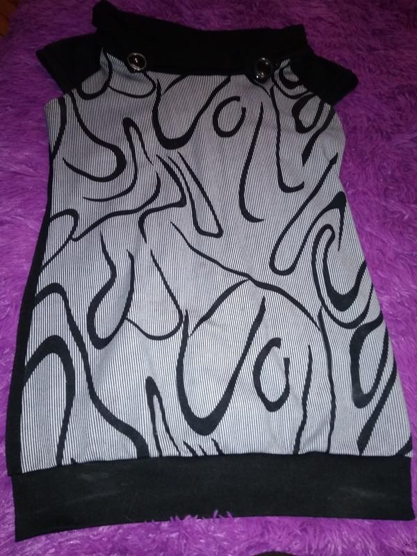 Очень интересная туника из плотного трикотажа.Сзади черная, спереди рисунок.Приятная ткань,качество-супер.Отлично сочетается с водолазками и гольфиками.