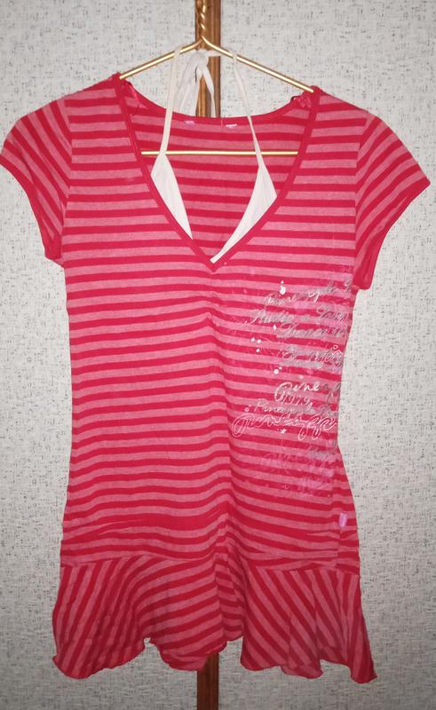 Футболка подовжена із зав'язками на шиї. Довжина виробу - 70 див. ПОГ - 45 див. Склад: 74% Cotton 26% Polyester