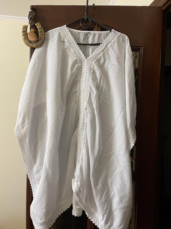 Туника из тонкого хлопка с прошвой. Ширина 106 см, между боковыми швами 66 см. Длина 86 см. Прекрасное решение для отдыха на море.