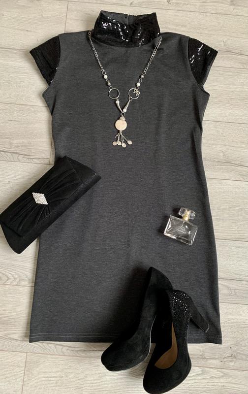 Плаття трикотажне, сірого кольору, горловина стійкою. Горловина і рукав оброблені чорними паєтками. Взимку можна одягати на гольфик сіточку. Стан дуже хороший. ПОГ 45, ПОП 39, Довжина 82.