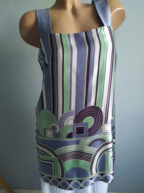 Туника, длинный топ из натурального шелка в стилистике 80-х г.г., полностью на подкладке, широкие фиксированные бретели, прямой крой, в области бедер по бокам шлевки для пояса, ленты, платка и т.д.(при необходимости их можно отпороть), очен подходит под брюки, лосины, размер европейский 38 (английский 10), замеры: длина - 77 см, ПОГ - 45 см, ПОБ - 53-54 см. ВОЗВРАТА и ОБМЕНА ТОВАРА НЕТ!