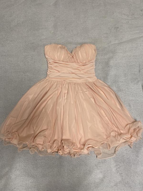 Вечірня коктейльна сукня персикового кольору, розмір S. Дуже гарна якість. Стан ідеальний, одягала 1 раз Заміри: Груди 40 см Талія 35 см Довжина сукні 68 см