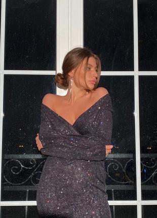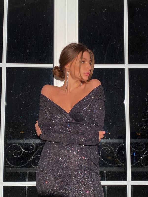 Арт 340 | Сукня Queen night (midi) Неймовірна, сексуальна і мерехтлива сукня з V-подібний виріз чудово підкреслює жіночі груди та лінію шиї👗 Сукня Queen night відмінна модель для святкування Нового року, дня народження чи іншого заходу 👑 • Тканина: трикотаж люрекс з блискітками • Підкладка: трикотаж • Розмір: oversize (42-44) • Кольори: чорний/золото, чорний/срібло, чорний/хамелеон, чорно/золото червоний, білий/срібло