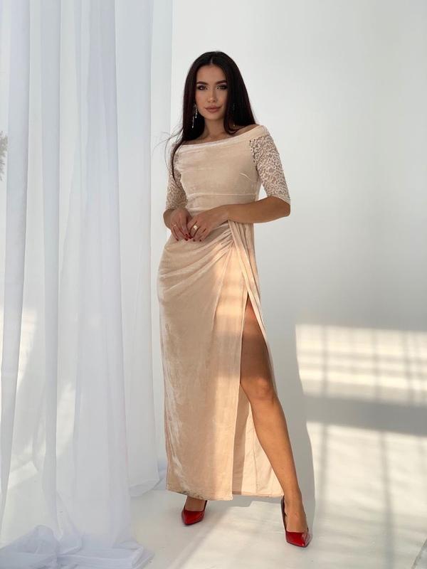 Цвет: бежевый Тканина:оксамит, гіпюр, Длина:140 см Длина рукава:36 см Рост модели:168 см размеры:42-44,46-48