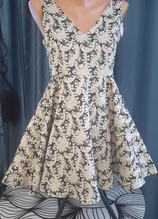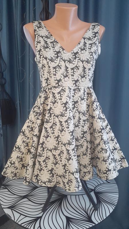 Гарна святкова сукня для важливих подій. Підійде на випуск, на весілля дружці, на ювілей. З цупкої тканини. Гарно тримає форму. Спідничка сонцем. Коротка, але не критично. Просто ваблююча. Має підклад. Спинка прикрашена поглиблиним вирізом кутиком. Розмір S-M. Стан нової речі. Замовляйте. Будете гарні і задоволені. В грудях 42см В талії 37см Довжина від плеча до талаї 34см Довжина від талії до низу 44см