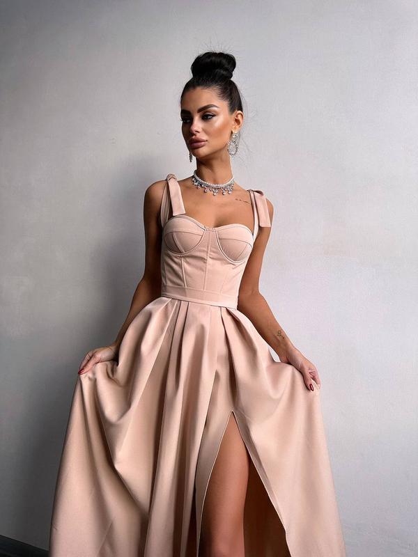Жіноча вишукана ошатна вечірня бежева довга сукня з корсетним верхом в підлогу на випускни...
