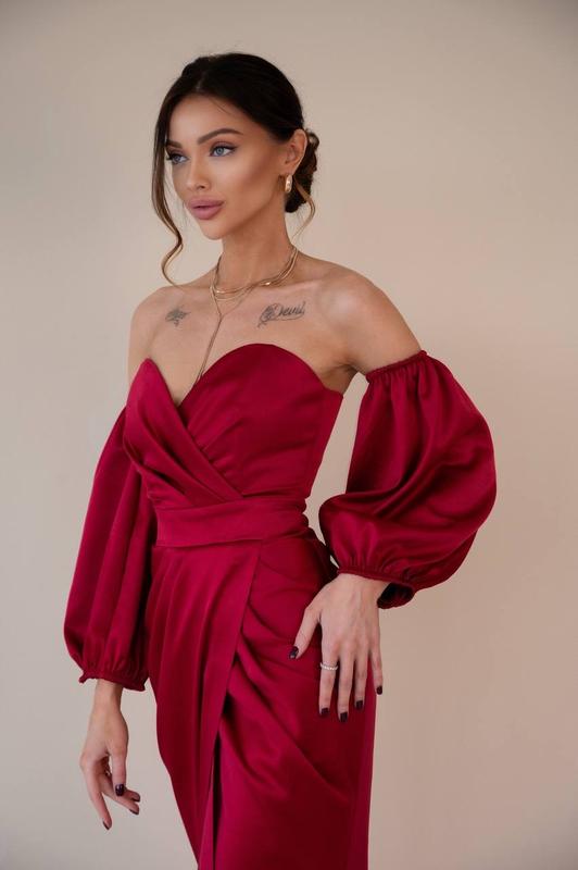 Роскошное платье со шлейфом и разрезом от бедра🥰 В этом платье отлично все. Объемные рукава, которые можно снять. Когда в одном платье соединились роскошная ткань, корсетный верх в виде сердца, шлейф и разрез от бедра – получается настоящий шедевр. Размер: XS (под заказ) Размер: S, M Размер: L, XL (под заказ +400грн) Материал: королевский атлас Цена: 1600 грн