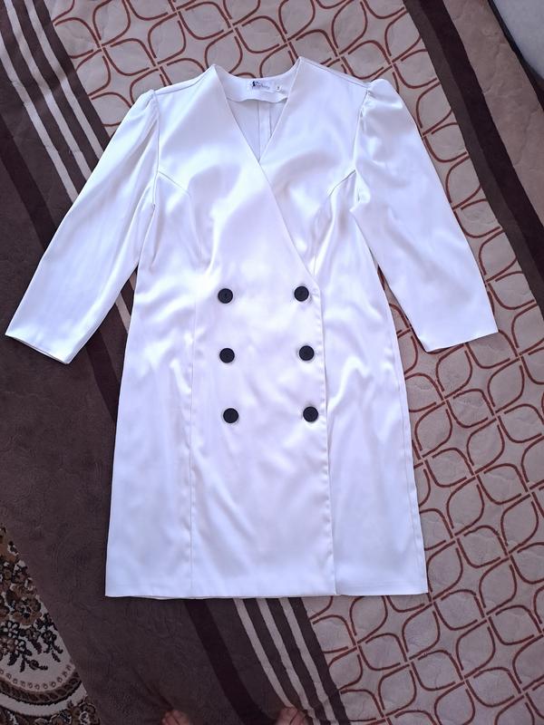 Дуже красива біла атласна сукня-піджак з чорними ґудзиками. Одягала один раз на святкування хрестин донечки. Сукня гарно приховала післяпологовий животик та зробила фігуру більш стрункою.. Півобхват грудей - 48 см Півобхват талії - 46 см Півобхват стегон - 56 см