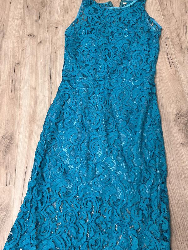 Вечірня сукня з мереживом , гарний колір насичений бірюзовий , брала на весілля , вдягалась 1 раз , розмір xs-s , довга , в мене зріст 158 але брала під високий каблук , стан ідеальний, якісне мереживо , український бренд