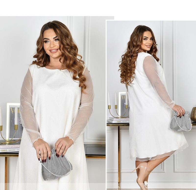 Сукня №8644-молочний Розмір: 50-52, 54-56, 58-60 Склад: поліамід - 88%, еластан - 12% Матеріал: костюмка барбі, євро-сітка з блискіткою Розтяжність: Середня розтяжність (2-4см) Орієнтовні заміри готового виробу: 50-52 р-р: довжина сукні 107см, довжина рукава від плечового шва 62см, обхват рукава 36см, ОГ - 104см, ОТ -120см, OC -134см. 54-56 р-р: довжина сукні 107см, довжина рукава від плечового шва 62см, обхват рукава 38см, ОГ - 112см, ОТ -128см, OC -142см. 58-60 р-р: довжина сукні 107см, довжина рукава від плечового шва 62см, обхват рукава 40см, ОГ - 120см, ОТ -136см, OC -150см.