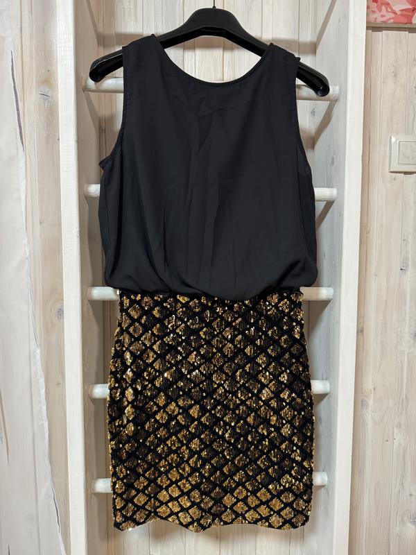 Чорне плаття, розмір М, довжина 90 см. Спідниця вишита золотими паєтками, верх - Котельва підкладка і зверху шифон. На спині - замовляла. Стан -ідеальний.
