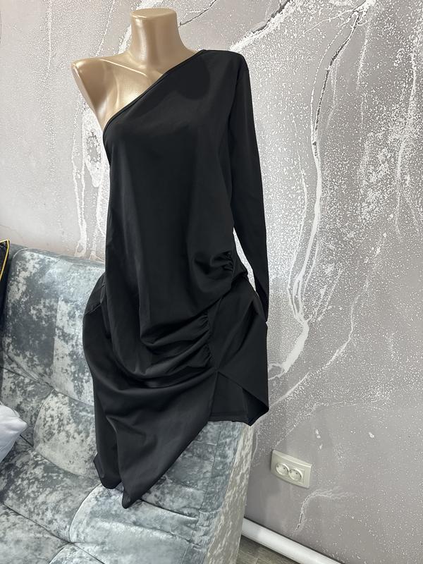 Дуже класна сукня із зборкою та розрізом на ніжці. Рукав -57 см, пог:50-65 см, Пот -46-59 см, по стегнам -56-74 см, довжина -109 см. Тягнеться супер