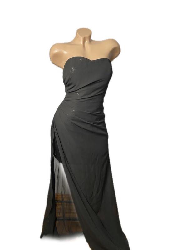 Шикарна корсетна сукня на с м буде добре Основа -коротка сукня в паетку Зверху чорний довгий шифон Сукня з розрізом по ніжці Є маленький дефект з низу на шифоні
