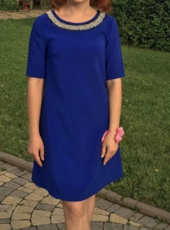 Продам сукню синього кольору з декоративним оздобленням з каміння. В носці 1 раз на свято. На фото одягнуто на хс, але за рахунок вільного крою підійде на с, можливо на невелику м, дивитись по замірам Відсутній один камінчик, та є декілька невеликих затяжок. Одягнуто на фото на зріст 154 см