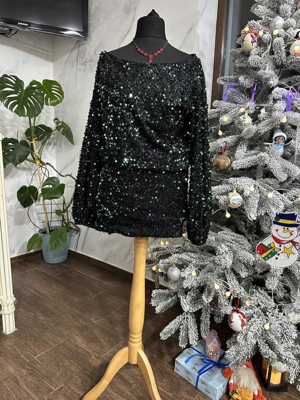 Сукня з пайєтами, Має чорний підклад, зверху пайєтки. Рукав широкий 57см (гарно тягнеться) Довжина сукні 85 см. Напівобхват 52 (тягнеться добре) Напівобхват талії 48. Чудово підійде на Новий рік, одягала один раз, сукня в ідеальному стані.