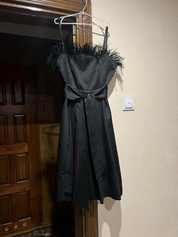 Продам вечірню сукню з пір"ям на бретелях. Бретелі регулюються. Збоку застібка- замочок. Плаття на підкладці. Знизу червоний атлас. Пояс з однієї сторони чорний, з іншої- червоний. Довжина 100 см , пояс-84 см , обхват грудей- 96 см. Підходить для новорічних святкувань.