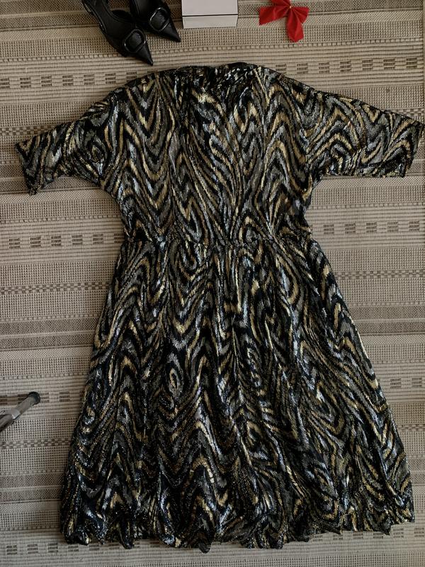 Плаття накидка з срібним та золотим люрексом дуже святкова виглядає дуже гарно вона пишна Воно просвічує тому під низ треба базу «рукав опущене плече Стан хороший Розмір 2хл -3хл Довжина 124 Груди 62 Талія 49