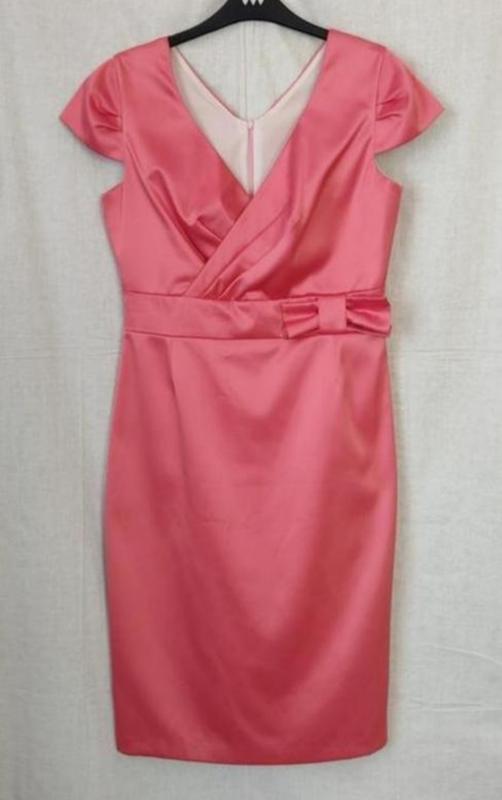 Святкова сукня з атласної тканини рожево- коралового кольору; рукави короткі-крильця; по відрізній талії широкий пояс; прикрашений бантом; ззаду виріз і довгий потаємний замочок; верх переда дуже красиво задрапований на "запах"; ззаду внизу шлиця; на тонкій шовковій підкладці білого кольору. Дівчина в такій сукні на будь-якій урочистості приверне до себе увагу. Тканина виглядає як щільний матовий атлас. Бренд Rene. Виробництво Польща. Виміри: довжина -106, від плеча до талії-36; ширина пояса-6; ног-47;; нот-40; нос-48; обхват низу -96; розріз-26. 5 Розмір eur-38(44). Без слідів носіння. Виріб дуже якісний.