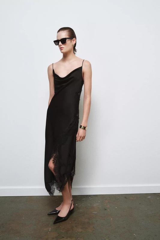 Атласна сукня-комбінація з плавним вирізом і тонкими бретелями. Збоку драпірування. Асиметричний низ з мереживною аплікацією в тон. ЧОРНИЙ | 5919/215/800