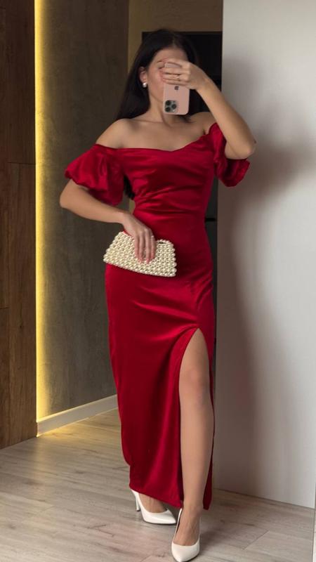 Вишукана вечірня жіноча сукня з відкритими плечима та розрізом на ніжці✨є відео!