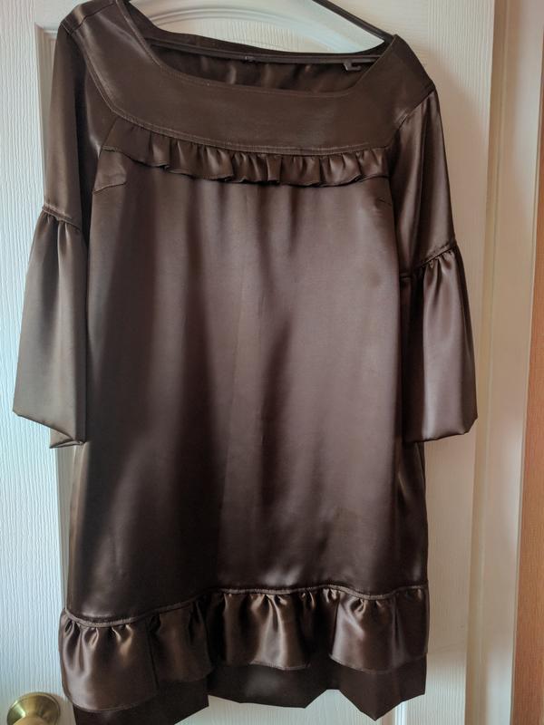Платье новое, шилось на заказ из плотного атласа, немного стрейч, очень красивое, шоколадного цвета. Пот-51, поб-56, длинна-89, плечи-45, рукав-45. Дополнительные фото и замеры вышлю.