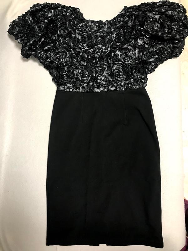 Чорна вечірня сукня, має масивний верх, оздоблений квітами з еко шкіри, гарно лягає по талії, стан ідеальний