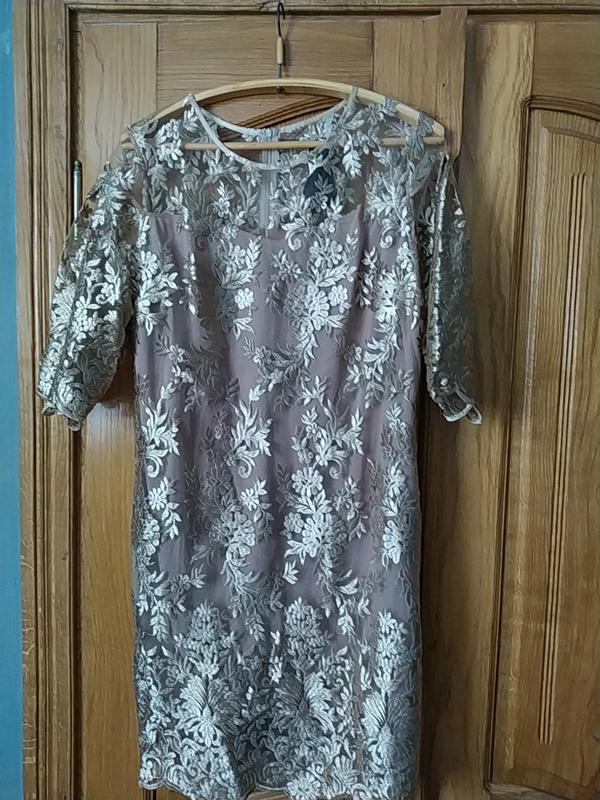 надзвичайно красиве 👗 плаття, нове, (ajiotaje),верх - мереживо золотистого кольору високої якості, низ - трикотажна підкладка, ззаду - замок, для особливих подій, вишукане. Пог -59см, довжина 105см, плечі -44см