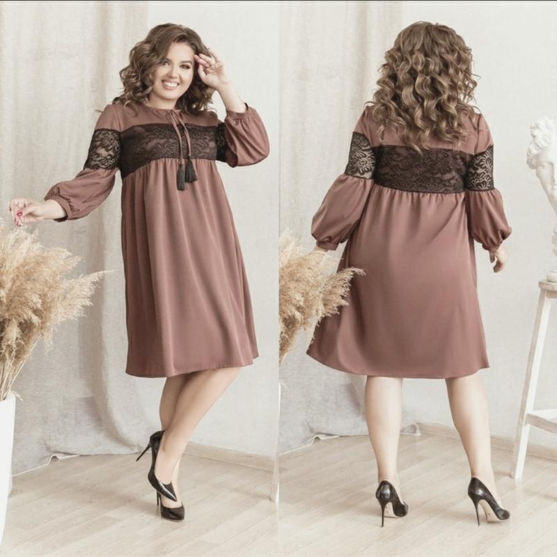 Сукня Сукня вільного крою з декоративними шнурками і вставкою з якісного гіпюру. Тканина: костюмка армані, гіпюр Довжина (52-54) вироби - 100 см, рукав – 55 см колір капучіно.