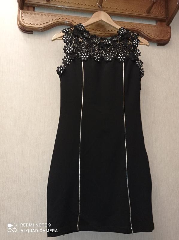 Сукня чорного кольору з мереживом на верхній частині виробу, яке прикрашене камінцями. Також сукня оздоблена двома срібними вставками. Ширина сукні 43/36/46.