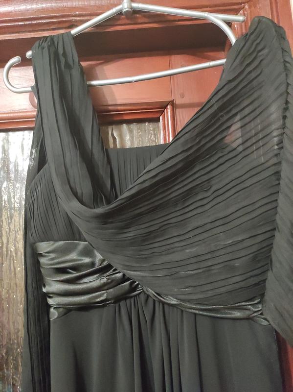 Коктельное чёрное платье миди, воздушное и нежное. Сбоку есть змейка, имеются шлеечки, которые регулируются. К платью идёт шарфик. Очень классное платье, будете довольны.