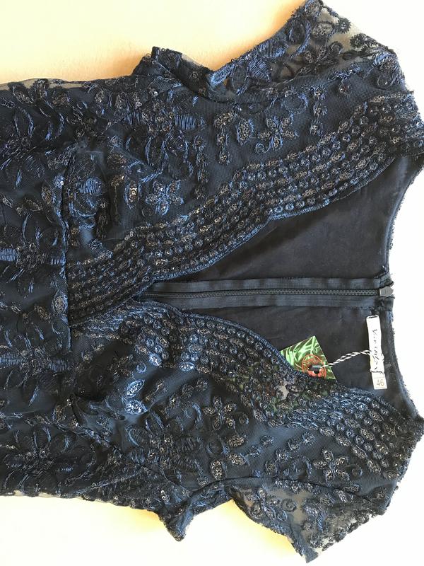 Ефектне плаття приталеного силуету, темно-синього кольору,розшите пайєтками.Не просвічується - з підкладкою.Хто любити носити глибоке декольте-це буде саме «воно»,бо саме цю зону плаття підкреслює ідеально))! Розмір-46 Довжина 85 Напівобхват грудей 42 (+ тягнеться) Напівобхват талії 38 Плечі 36 Ціна 500грн Безпечна оплата Новою поштою вітається.
