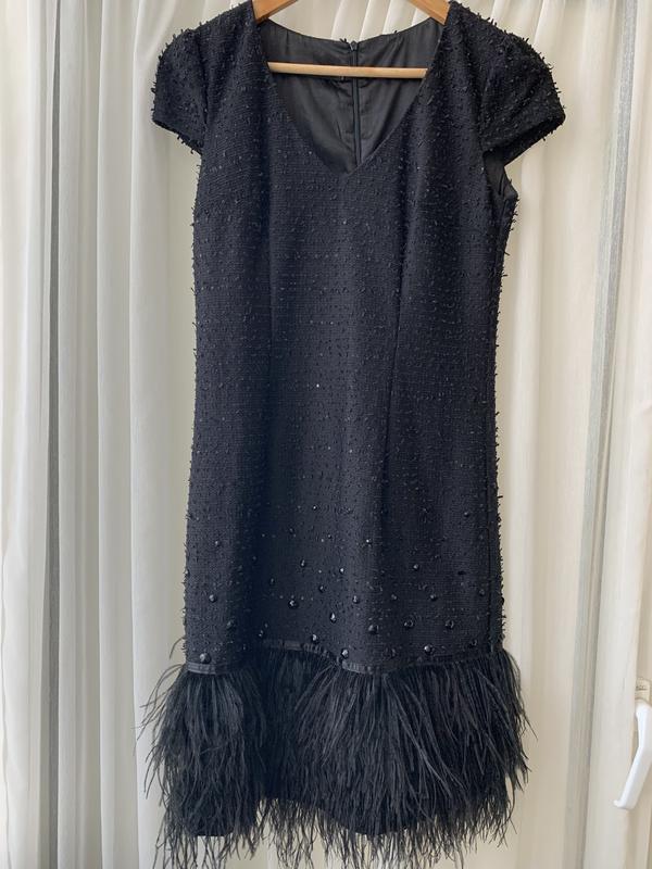 Вечірнє чорне платячко,яке має бути в гардеробі кожної жінки, елегантне і вишукане,яке буде підкреслювати фігуру)) має по спинці змійку і знизу імітація пір'я ) стан ідеальний)) Підходить для будь-якого сезону і події