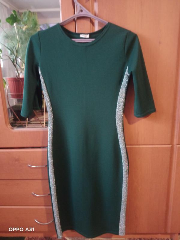Платье красивого зелёного цвета,с серебряной вставкой по бокам,до колена.