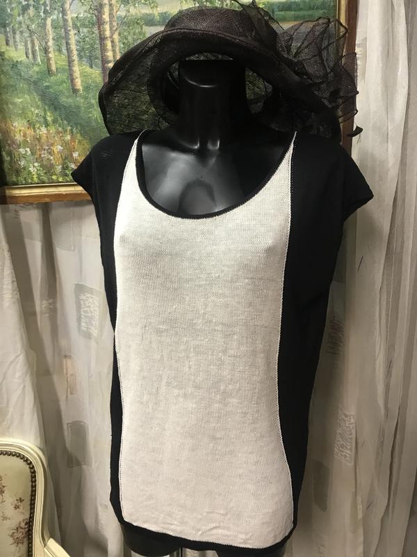 Стильна і дуже якісна блуза від Armani Exchange. Класика-чорне з білим. Рукавчик спущений, ззаду красиво застібається на гудзик. Склад:льон /нейлон(62/38). Розмір на бірці S/P. Заміри: довжина-66 см, ПОГ-50 см, ПОБІДИ-42см. Відмінна якість виробу!