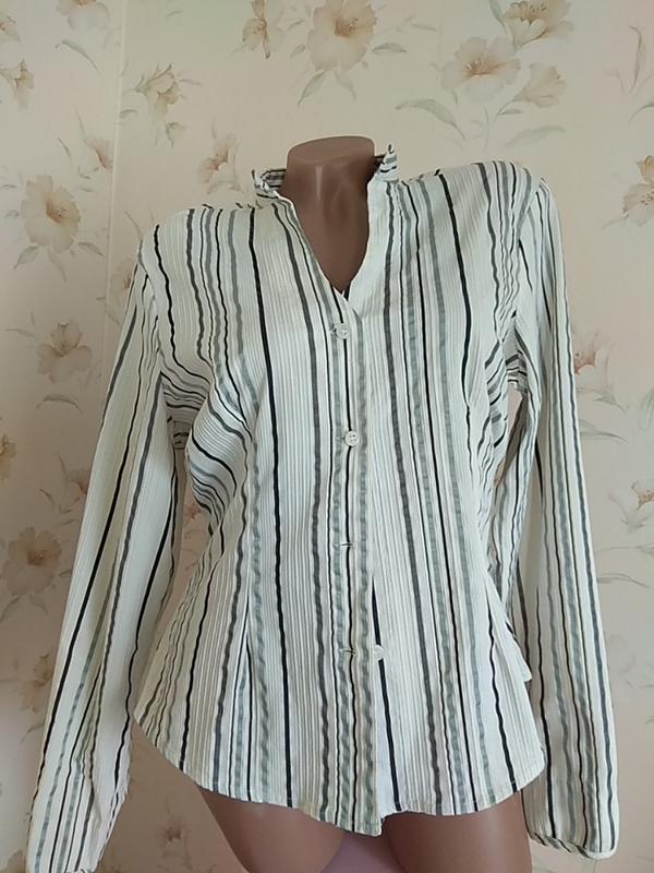 Шикарна брендовий біла блузка в подовжню смужку. Дуже струнким. Приталений силует. Комірець стійка, глибокий виріз. На гудзиках спереду. У грудях виточки. Тканина тягнеться, що дозволяє ідеально лягає по фігурі. Довгий рукав, знизу на пуговичке. Дуже стильно й ефектно виглядає з спідницею,брюками,лосинами. Може бути як блейзер або легкий піджак. Стан нової речі без паперової бирки. Сліди шкарпетки відсутні. Дефектів немає.