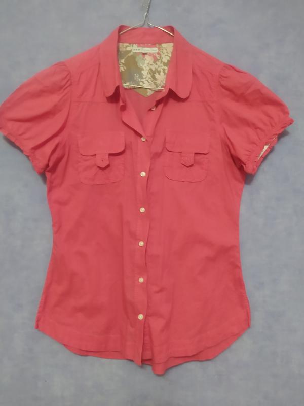 Блуза рожево-червона. Форма пряма. Тканина Катон. На рукавах на рукавах усередині гумка піжтримувати рукав. Розмір 40. Заміри: півобхват грудей 48 см, півобхват талії 44 см, півобхват низу 51 см, довжина 63 см