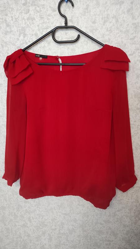 Дуже гарна блуза, на плечиках бантики Розмір універсальний 42-46 Колір червоний (не такий яскравий як на фото) Рукава 3/4 шифонові без підкладки ПОГ 49 см Довжина 57 см Тканина шивон, має підкладку