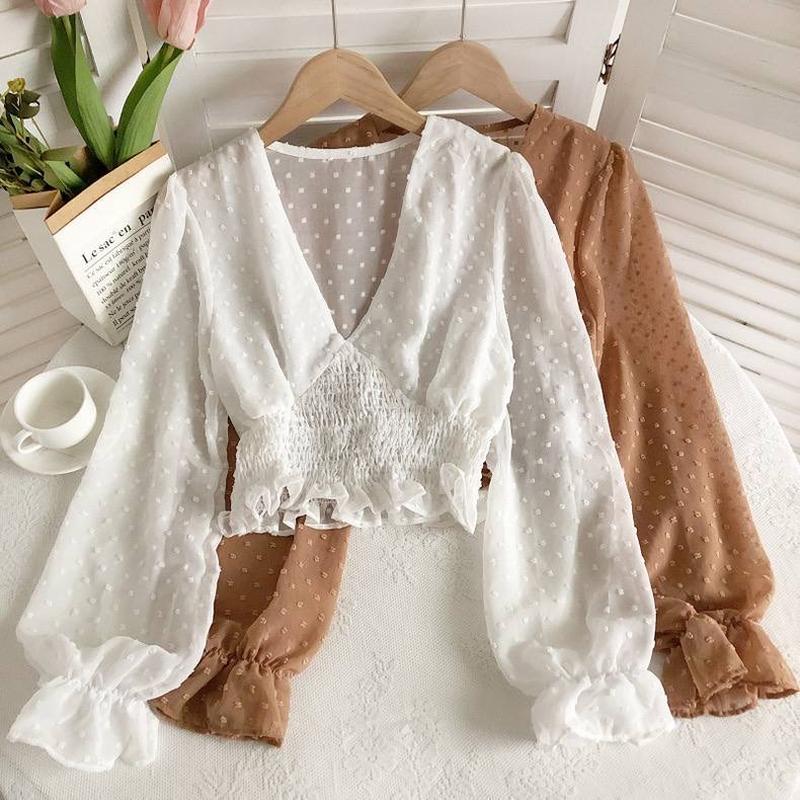Красивая блузка в горошек с v-образным вырезом💕 Размер: универсал 42-44 Цвет: бежевый, белый, черный Тканина: шифон